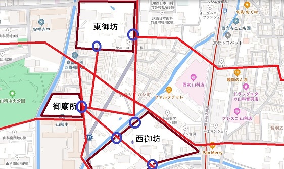 まず大正11年(1922)の地図を見ると、周囲に田畑などが広がっているものの、東御坊・西御坊・山階校の位置や道自身は現在のものと大きく変わっていないことがわかる。ただし音羽川小学校(正門側)から外環状線を越えて西御坊の北を通り北西方向へと続く道は、安祥寺川を越え、鐘紡工場の中を通っていることがわかる。他の地図と対照すると、道筋は西野様子見町と今屋敷町との町境となっており、町を分ける形でこの道が通っていたことがわかる。この道もかなりの古道に違いない。