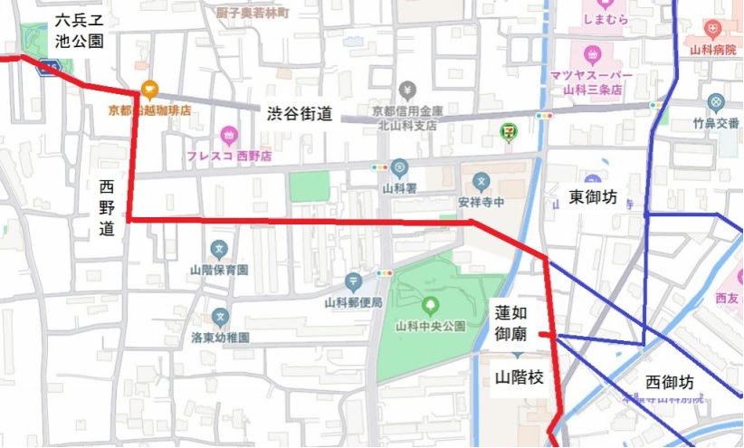 令和7年(2025)の秋、西野学区の自治連会長さんから「学区民歩こう会で山科中央公園から小山の白石神社まで歩きたいので、案内・解説をして欲しい」という依頼があった。せっかくの機会なので「中世に造営された(と思われる)古道を歩きましょう」と言って、「永正14年(1517)に造営された山科本願寺から小山までの新道」について、私が想定した道を案内することにした。そのコースが次の地図である。西御坊の木札には「東北」と書かれてはいるが、実際の小山地域は、山科本願寺や蓮如上人御廟所からは、ほとんど真東の位置となる。西御坊の北側を東西に通る道は、山科本願寺と南殿を結ぶ「御坊道」だけでなく、さらに圓如上人御廟を結ぶ「御塚道」でもあったと考えられるのである。