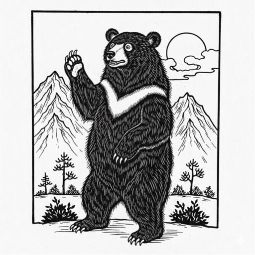 イラストはよく出没するツキノワグマです。Geminiに描いてもらいました。何も言わなくても背景の山や木も描いてくれて、なかなかのものです。