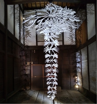 初日は旧市街巡りをしました。旧市街はバスでも行けますが、バス停から近い場所ばかりというわけでもなく、会場が広範囲に渡るので、駅から歩くことにしました。旧伴家住宅、旧西川家住宅、西川庄六別邸、幸村邸隠居、ティースペース茶楽、カネ吉別邸、藤ya、まちや倶楽部、山本家、旧扇吉もろみ倉、禧長の11か所を制覇しました。旧市街はきれいな街並みが維持され、どこも古い家を修繕したり、改修したりして、上手に使われていると感心しました。「別邸」「隠居」などの名称から八幡商人は本家に近い場所にセカンド・ハウスや隠居用の家を建てていたことがわかります。旧家は天井が高く土間が広くて、そこにも作品が展示されていました。暗めの土間に天窓から淡い光が注ぎ、展示されたアート作品が幻想的に見えました。旧家は部屋数が多く、それぞれの部屋に異なるアーティストの作品が展示されていました。大多数が日本人の作家でしたが、フランス、ポーランドなど欧州の作家が10名、中国人の作家が3名いました。すべてが現代アート作品でしたが、それが古い家や座敷や庭に見事に溶け込んでいて、違和感はまったくありませんでした。京都の二条城や両足院などでも現代アートの展示がなされますが、古い建物と新しいアートの組み合わせが建物とアートの両方を引き立て、独特の雰囲気をかもしだしています。それを見る人は鑑賞するだけでなく、思考をめぐらすことになり、哲学的、精神的なものを感じ取るはずです。