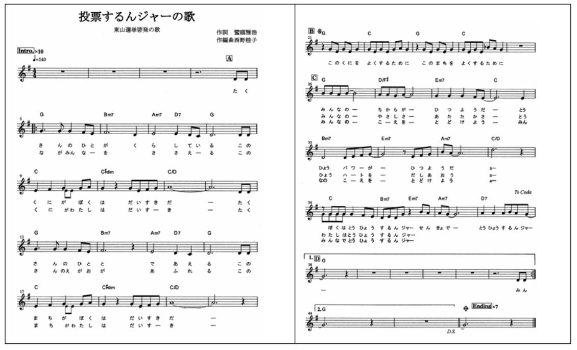 写真は「投票するんジャーの歌」の楽譜