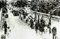 (15)近代の花山中学校区−−鐘紡工場女工たちの大ストライキ 山科地域の中央部に、11階建ての高層住宅の建ち並ぶ「山科団地」がある。中央にある「山科中央公園」は、様々な文化・スポーツ行事等が行われ、山科区民の交流の場ともなっている。 この山科団地が出来る前には、この土地は「鐘淵紡績会社(鐘紡)の山科工場」であったということを知る人は、年々少なくなっている。ましてや、日本が戦争への道を歩み始めた昭和の初期に、この工場で大規模な女工たちのストライキ闘争が行われたことを知っている人は、ほとんどいないと言っても良い。戦前の厳しい時代に、生活と権利を守るために立ち上がった山科の女性たちの闘いがあった。 大規模な工場が山科に進出したのは、1917年(大正6年)の事である。この年に、最大の工場として西野地域に、鐘紡山科工場が生まれた。この鐘紡山科工場は、当時としては本格的な近代工場であり、多いときには1656名もの女工を抱えていたという。女工たちの多くは、地元山科地域と地方出身の農家の娘たちであった。 1930年(昭和5年)4月10日に始まった鐘淵紡績会社(鐘紡)大争議は、当時最大の紡績会社で、温情主義的労務管理で組合を寄せ付けず、一度の争議も起きなかったところに、突如ストライキが決行されたことで、全国に大きな衝撃を与えた。抜き打ち的に4割の賃金大幅引き下げを通告した会社側に対する労働者たちの生活をかけてのたたかいであった。戦前における最大でかつ最後の(これ以降は労働者の運動は弾圧された)ストライキであった。 【1】 1929年(昭和4年)10月24日に、ニューヨークのウォール街での株式市場の大暴落に始まる世界恐慌は、日本にも深刻な影響をもたらした。当時の日本の主要な輸出産業であった生糸の輸出は激減し、中国及びインドへの綿製品の輸出も減った。また貿易の不振は物価の暴落を呼び、慢性的な不況にあえいでいた日本経済に深刻な打撃を与えた。 これに対して独占資本家たちはカルテル(企業連合)を結びトラスト(企業合同)を誕生させ、中小企業や労働者の更なる犠牲を強要する中で切り抜けようとした。男女平均一日の賃金は、合理化のはじまる直前の1929年6月を100とすれば、同年12月には89、1930年末には64にまで下がっている。それだけ生産費は安くなり、資本家のもうける率は多くなったが、またそれだけ労働者の賃金は安くなり、労働の緊張度が強くされ、工場災害や職工の病気の率が増大した。大規模な首切りも行われた。 こうした中で、全国で労働者の闘いも勃発した。1929年(昭和4年)12月6日には東京市電・市バスのストが起こり、1930年(昭和5年)4月には全国規模での鐘紡(鐘淵紡績会社)スト、9月には東洋モスリンのストが起こった。その他、大同マッチ、東京市役所、大阪湯浅伸銅、星製薬、横浜ドック、京都電機、富士ガス紡、などでも闘いが行われている。労働争議は、ストライキを伴うものだけでも1929年(昭和4年)には576件、1930年(昭和5年)には906件、1931年(昭和6年)には998件、1932年(昭和7年)には893件と、戦前、最大でまた最後の(その後厳しい弾圧で潰されてしまった)激しい闘いが繰り広げられた。 【2】 鐘淵紡績会社(鐘紡)は、それまで武藤山治(むとうさんじ)が長年「温情主義」「家族主義」を売り物にして、労働組合も結成されていなかったが、恐慌による輸出不振と株価暴落のあおりで東京株式取引所の自社株は、前年の236円から215円に下がり、さらに144円と急激な下降を続けた。鐘紡はこうした事態を、労働者の賃下げと生産調整(首切り)で切り抜けようとしていた。 しかし、4月5日に会社側から抜き打ちに4割の賃金大幅引き下げが通告されると、大阪淀川工場からはじまったストライキが全国の工場に広がった。京都では、大阪の淀川工場の労働者(男子工・女子工)からの呼びかけに応じて、山科・上京・高野らの各工場が、争議団を組織し、全国に先がけてストライキに突入した。こうして、女工を主体とする35,000人の従業員が東京、京都、大阪、兵庫等、全国の各工場で一斉にストライキに入ったのである。 【3】 1930年(昭和5年)4月5日に会社側は、抜き打ち的に4割の賃金大幅引き下げを通告した。会社側は理由を、「戦時物価の高騰にかんがみて、社員は本給の6割、職工は7割の手當(てあて)を支給した。その手當の減給である。」と説明した。これに対して、女工たちは「戦時当時と比べて賞与は1割減、昇給は男子工7年延期、女子工3年延期、食費を15銭から20銭に値上げ、白米券支給の廃止、これらで戦時から見ると実質賃金は7割近くも値下がっており、このうえ4割の値下げとは何事だ。株主へは毎年3割五分以上の利益を配当しているではないか。」(1930.4.7日出新聞)と、反対の気勢を上げて、総罷業(ストライキ)に入ってでも闘うという姿勢を示した。 当時の鐘紡工場内には労働組合などの組織はなかったが、新聞報道で事態を知った全日本労働総同盟京都府連合会は、まず市内最大の工場で4000名の女工