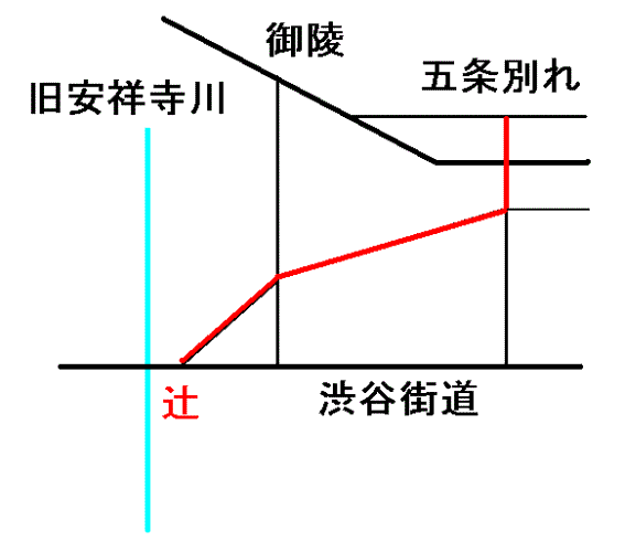 山科の旧三条街道筋に「五条別れ」という所がある。「五条別れ」と言えば、現在は、府道四ノ宮四ツ塚線の京都薬科大学南東側の交差点ということになるが、昔は旧三条街道との交差点のことであって、京都薬科大学北東側に道標が残っている。この交差点は、言葉の通り、旧三条通りから五条通りに抜ける道の分岐点を意味している。昔は現在の国道一号線はなかったのだから、当時五条に抜ける道というのは、渋谷街道をおいてほかにはない。そうすると、渋谷街道から「辻」を通って、厨子奥を越えてきた道の終点は。ここであることがわかってくる。