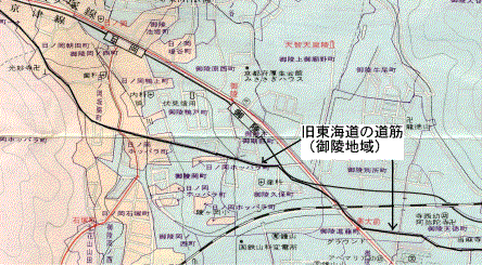 (8)旧「東海道」の路はどうつながっているのか 御陵地域を東西に横断する道に旧東海道(現在の旧三条通=山科北通りとも呼ばれる)がある。御陵地域は、ある意味ではこの旧東海道に沿って発展した村であると言うことも出来る。東海道は、京都の「七口」の一つである粟田口から出て、日ノ岡峠を越えて、四ノ宮河原など山科北部を経て大津に達する。昔は、「大津街道」「三条街道」とも呼ばれた。平安京が出来て以来の、東海・東山・北陸への最重要路であった。949年(天暦3年)の「日本紀略」には「粟田山路は、・・・己に損害をなす。車馬の往還、甚煩多し」と、日ノ岡峠越えの難所ぶりと車馬の交通の様子を伝えている。道路の修復工事もたびたび行われ、1706(宝永3)年、1736年(元文元年)、1867年(慶応3年)、1875年(明治8年)などに記録が残されている。 とりわけ、1706(宝永3)年の「三条海道車道付け」は大工事だったようで、その年の11月から翌年の3月まで、山科の各村々に「分担場所」と「人足(にんそく)」を割り当て、のべ1万0397人を動員したという。御陵村の負担(分担場所)は、807間(けん)(約1500メートル)と最も多い。ちなみに、北花山村は51間、上花山村43間、西野村185間、日ノ岡村181間などで、合計20村に3296間(約6キロメートル)を割り当てている。御陵村だけで全体の4分の1を請け負っているのである。 道筋もたびたび変更された。また花崗岩の板石に轍(わだち)をうがった車石(くるまいし)が敷設されて牛馬車による荷物運送を容易にした。現在、日ノ岡峠付近の道の側壁に車石を埋め込んだ車石記念碑がある。 1873年(明治6年)の「日本見聞録」には次のように記録されている。「三井寺から下りて、我々はあと三里しかない京都への道をとった。大街道−相変わらず東海道−はその道幅の半分は一つの町から他の町まで舗装されており、これらの広い舗石の上には二つの平行した轍(わだち)が長年月の間に牛馬の車輪でうがたれている。この鈍重な動物−京都の牛種はきわめて大きい−が縦につながれていて田舎や都会の産物を積んだ車をゆっくりと二つの狭い轍(わだち)からそれずにひいてゆくのを見るのは面白い光景である。この車の車輪は目のつんだ木でできている。この柔軟な花崗岩の中に深さ七または八センチメートルの溝を掘るには何世紀かかったのだろうか!」。 またアーネスト・サトウの「一外交官の見た明治維新」では「京都から次の休憩所である大津までは、沿道にずっと石を畳んだ、一種の軌道になっていた。これは、重い荷物を積んだ、幅の広い車輪のついている牛車にそなえたものだ。我々の駕籠(カゴ)は、京都にいる大君の守備隊へ供出する米俵をのせた四十台の牛車を追い越した。」 この道は、その後、御陵地域で、旧国道一号線(現在の府道四宮−四ツ塚線)や、京阪電車、国鉄東海道線(現在のJR線)などで分断され、道筋も不明確な部分がある。さまざまな史料から私が再現してみた道筋は、下の地図に示した通りである。