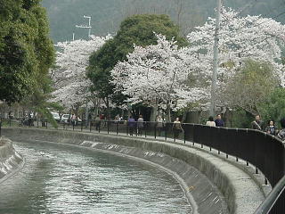 (24)山科疏水の花見見物もSLの煙にじゃまされていた 大澤陽典は「旧鉄道線路と琵琶湖疏水」の中で、昔の疏水周辺を次のように回想している。 「鉄道(東海道線)に遅れること10年にして完成したのが、琵琶湖疏水である。通水以来ながらく改変をみず、ただ両岸の桜並木が時とともに濃いかげを水面に落とすようになり、花見時には山科人の憩いの場所として貴重だった。しかし、花見の際に閉口することが一つ、それは下を走る東海道線の汽車(SL)の煤煙である。下りはかすかな白煙だけだが、勾配を登る上りは物すごい黒煙を吐きつつやってくる。南風にあふられれば、まともに吹き付ける。そう言えば洗濯物も被害を受けたし、積もった白雪にすすがつくことも稀ではなかった。貨物列車の地響きのすごかったことも忘れられない。湖西線開通のため、一灯園から毘沙門道の手前までのトンネルによる水路変更で、諸羽神社上のダムが消え、柳山の麓の旧水路あとは公園化された。子どもの頃はまだ荷物−−砂などが多かった−−を運ぶ舟が行き来し、上りは船頭が肩綱で舟を引っぱって行った。花見時には提灯をつけた屋形舟が客をのせた。南禅寺へ出仕していた祖父が、荷舟に飛び乗って蹴上まで便乗していた話もよく母から聞かされたものだ。(京阪)電車がつく以前は京都へ出るのにも利用したらしい。また疏水は子どもたちの水泳の場でもあり、主としてダムがその役割を果たしたが、熟練者は逢坂山のトンネル出口から流れてくるのを得意がったものだ。今は遊泳禁止となり、安全柵がほどこされ、ダムあとの広場につくられた幼児のための水遊び場が、疏水区域内で水と戯れる唯一の施設となってしまった。ただ舟運のころには見られなかった風景としては魚釣りに興じる大人や子どもの姿がある。この疏水沿いの道はおそらく今日、山科でもっともと言うより、山科の良さを保っている唯一の場所と言えよう。」 |