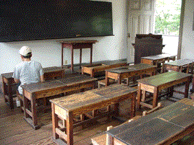 |  明治時代に使われていた 小学校の教室(明治村) | (8)明治初期の西野地域と山階小学校の移転 1872(明治5)年に開校し、それまで東野村の西本願寺山科別院内対面所を借りて開校していた小学校が、1880(明治13)年4月に、西野地域の現在地に新築・移転され、学校名も「山階小学校」と命名された。この地は海老名遠江守の城跡であったと言われている。 現在も同校内にあるクスノキは、明治の中頃、当時の本通りであった醍醐街道沿いのくずれ積みの石垣に沿って卒業記念樹として植樹されたもので、樹齢90年余、幹まわりは2・5メートルを超える。また同校に残るプラタナスは大正時代の初期に記念樹として植えられたものである。1880(明治13)年というのは、7月には京都─大津間の鉄道が開通した年でもある。 山階小学校は当初、山科北・中部全域を通学区とし、山科における小学校教育の中心となっていた。山科南部の子ども達は、やはり1872(明治5)年に開校していた勧修小学校が、1881(明治14)年6月に現在地に新校舎が完成したため、そちらに通った。 以後、人口増大にともなう児童数の増加によって山階小学校からは鏡山小学校、音羽小学校が分離、独立して、戦後は山科中学校が誕生、「山科4小学校、1中学校」体制は昭和中期まで続くことになった。 明治初期の小学校は、まだ「夏休み」がなかった。そのため、1881(明治14)年7月には、山階校から「8月1日から8月31日の間は、午前7時始業、10時終業にしたい」という、今日で言う「短縮授業」の申請が出されてたりしていた。 | ||||||||||||||||||||||||||||||||||||||||||