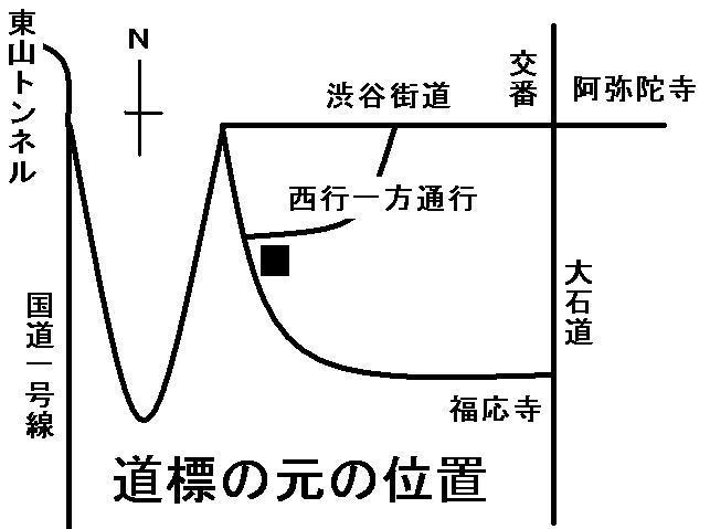 最初に設置されていた場所については、地元の人から「福応寺から南へ行った三叉路の角辺り」という話もあったが、『京都の道標』の本によって、北花山市田町89番地の、渋谷街道を東から登ってくる一方通行になっている道と、北花山西ノ野町から上花山に向かう里道との三叉路の南東角にあったということもわかってきた。(左地図参照)