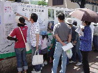 私たち「ふるさとの良さを活かしたまちづくりを進める会(略称・ふるさとの会)」は、2008年6月1日(日)、「陵ヶ岡・みどりの径ふれあいまつり」(陵ヶ岡自治連合会・同社会福祉協議会主催)に参加し、「ふるさと再発見・陵ヶ岡の魅力 とっておき50選」と題して写真のパネル展示を行うと共に、地元の竹藪でとれた竹を使って「竹ぽっくり」「竹返し」「青竹踏み」などを地元の方に紹介しました。たくさんの方に鑑賞していただき、用意したチラシも300人以上の方にお配りすることができました。