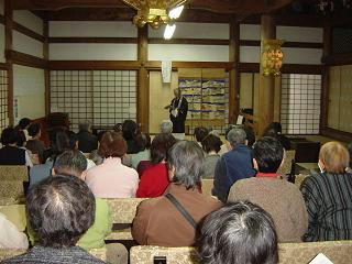 (2008年)11月29日(土)、午後1時半から4時まで、山科区西野の西宗寺をお借りして「ふるさとの会創立一周年記念の集い」が行われ、52名の参加がありました。 はじめに、西宗寺ご住職の海老名研真さんと、「ふるさとの会」事務局長の浅井定雄さんからあいさつがありました。 続いて、「源氏物語を古語で語る」として、むらさきの会主宰の今井友子さんから、「若紫の帖」を解説を交えて、古語。京アクセントでの「語り」を聞きました。平安時代当時の宮中の様子や、当時の情景を思い浮かべながら、参加者は美しい声の「語り」に聞き入り、すっかりと源氏物語の世界に浸ることができました。 そして、西宗寺ご住職の海老名研真さんより「西宗寺縁起と山科本願寺」と題して、約1時間のご講演をいただきました。 海老名さんは、西宗寺に伝わる蓮如絵図や縁起をもとに、蓮如上人の生涯と西宗寺との関わりを詳しく説明され、また寺に伝わる、当時の山科本願寺周辺の地図も見せていただき、参加者は思わず身を乗り出して見入っていました。 最後に、「ふるさとの会」第二回総会が行われ、事務局よりこの一年間の活動報告と、今後の計画、会計報告、新年度役員の提案などが行われ、審議の後、承認されました。 参加者からは「今年は源氏物語千年紀にあたり、タイムリーな企画だった」「今井さんの『語り』の世界に魅了された」「山科本願寺のことがよくわかった。ぜひシリーズでやってほしい」などの声が寄せられていました。 |