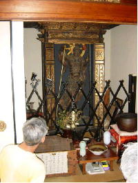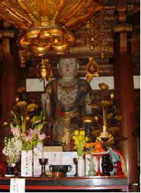 (5)厨子奥公会堂と毘沙門天像 ケンペルの江戸参拝旅行と同じ1692(元禄5)年に、厨子奥村の寺院の調査があり、浄土宗系の永正寺(えいしょうじ)、東本願寺系の光久寺が報告されています。永正寺は、永亨年間(1429〜1440)頃に開かれた寺ですが、1879(明治12)年に廃仏毀釈の影響で廃寺となり安朱来迎寺に合併されたとあります。「境内ニ毘沙門堂有、稲荷大明神ノ鎮守アリ」(『比留田家文書』1692)と記されていますので、今の厨子奥公会堂がその永正寺のあった場所です。 厨子奥公会堂の中には「毘沙門天立像」が安置されています。 「毘沙門天」(びしゃもんてん)は、仏法守護の神、四天王・十二天の一つで、須弥山(しゅみせん)の第四層中腹北側に住し、北方世界を守るとされています。黄色の身で忿怒(ふんぬ)の相をし、甲冑(かっちゅう)を着け、左手に宝塔を捧げ、右手に矛または宝棒を持ちます。 この厨子奥の「毘沙門天立像」は、もともと厨子奥の総鎮守として永正寺に安置されていたもので、もとは西方にあった毘沙門堂の本尊であったのですが、堂焼失後、永正寺に移されたと1742(寛保2)年の年記(永正寺の再興文書)に記録されているとのことです。14世紀前半(鎌倉時代末期)の制作と推定されています。 |