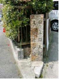 (3)牛尾街道交差点(南西)の道標 山科の「道標」については、「山科の歴史を知る会」が中心となって、かなり詳しく調べられています。1994(平成6)年4月1日に同会から発行された『山科の歴史探訪(5) 道標に見る山科』によれば、東海道関係で27柱、奈良街道・牛尾山関係で14柱、蓮如上人塚・山科御坊関係で14柱、渋谷街道・巡礼道関係で22柱、大石良雄遺訪・勧修寺関係で25柱、醍醐・日野関係で31柱、合計133柱が報告されています。 しかし、その中にも記載されておらず、存在が知られていなかった道標もあります。 牛尾街道と厨子奥本通りの交差点の南西側に建っていた道標もその一つです。 地元の人の話によると、戦後、いつの頃かは詳しくはわからないが、道標に車が当たって二つに壊れてしまったために、廃棄されたと言います。 たまたま、その上半部分が、あるお家の一角に保存されていたのが、見つかりました。 書かれている文字は、下半分はなくなっているので詳しくはわかりませんが、上半分は一面が「左 電車」とあり、二面は「右 花山」と読め、その下に「稲」らしい文字の上半分がかすかに読みとれます。また三面には「大正三年二月建(之?)」が読みとれ、四面には何も刻んでいません。 ここから、渋谷街道を東に歩いてきた人が三叉路から厨子奥本通りにを通って牛尾街道にさしかかった時に、左手に京阪電車京津線があって、それを指し示していると読めるし、また、御陵方面から牛尾街道を南に歩いてきた人が厨子奥本通りにさしかかった時に、右手に「花山」(あるいは花山稲荷神社への道か)があるので、それを指し示していると読みとることができます。 |