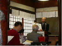 2009年2月22日(日)、ふるさとの会主催の「ふるさと講演会」が、北花山・阿弥陀寺本堂で開催され、四十九名が参加しました。 はじめに、阿弥陀寺のご住職である宮本俊昭氏からご挨拶がありました。宮本さんからは阿弥陀寺の縁起や代々伝わる寺宝の紹介、またご住職になられた経過など、約三十分間、お話をいただきました。 続いて、ふろしき研究会会員の松尾桂三さんから「風呂敷の便利な包み方」のお話をしていただきました。日本の生活文化の中に溶け込んでいる風呂敷ですが、多彩で便利な包み方の実演に、多くの方から感動の声が上がり、「今度はぜひ続編をやってほしい」との声も上がりました。 そして、ふるさとの会世話役の一人で、長年仏像などを研究しておられる吉田耕之助さんから、「仏像や日本庭園の見方」と題して約一時間、講演をしていただきまし 吉田さんは、「一概に仏像と言っても、いろいろな種類の仏像があり仏様がおられる。また印相というものがあって、そういったことをちょっと知っていれば、お寺などにお詣りする時に、たいへん参考になります」と話され、仏像や日本庭園に関する見方について詳しく話をされました。 最後に、「ふるさとの会」事務局から今後の行事(4・26歴史ウオーク)「6・21当麻寺での講演会」などの紹介が行われ閉会となりました。 |