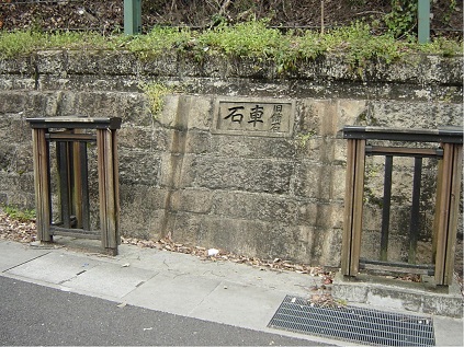 この辺りの擁壁石垣には、いくつもの「車石」をみつけることができる。この「旧舗石車石」碑は、道行く人に、この石が何に使われたかを解説するものとなっており、先人達が後世の私たちに残した「伝言板」である。(鏡山次郎)