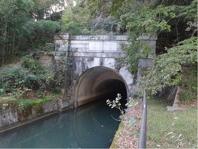 四季折々の変化を楽しませてくれる山科疏水ではあるが、初冬の景色もまた楽しい。疏水沿いを巡っていると、トンネルの入口に文字が彫り込まれた額(扁額)が見られるが、この時期には文字がけっこうよくわかる。山科では第一トンネル(藤尾トンネル)出口と、第二トンネル入口、出口。さらに第三トンネル入口の4つの扁額が見られるが、残念ながら第一トンネル出口のところは、大津市藤尾奥町で、山科区では無い。疏水面より道がかなり高いので、近くへ行ってよく見ることができないのが残念だ。山縣有朋による「廓其有容(かくとしてそれいるることあり)」という字が書いてある。