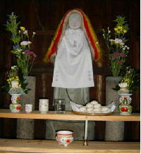 (1)地蔵菩薩とは ふだん、親しみを込めて「お地蔵さん」、「お地蔵様」と呼んでいるが、正式には「地蔵菩薩」という仏教の信仰対象である菩薩の一つである。古代インドに起源する神であるとも言う。梵名(サンスクリット名)で「クシティ(「地」・大地)・ガルバ(「蔵」・胎内)は、大地がすべての生命を育てる力を宿(蔵)しているように、苦しむ人たちを無限の慈悲で包み込み、救ってくれるという意味である。 仏教では、釈迦が入滅したのち弥勒が下生するまで(注:弥勒の下生は56億7千万年後とされている)の間は、この世に仏がいなくなるため、地蔵菩薩が修行僧の姿で現われ、六道の衆生を救うことを委嘱されたと説かれている。 地蔵信仰は、仏教が中国へ伝わってのち、隋、唐の時代に流行したと言われている。この地蔵信仰は、奈良時代に日本に伝えられたが、その普及は、平安時代後期になって、末法思想が流行してからである。地蔵は衆生を救う菩薩であることから、当時の阿弥陀信仰と結びつき、地獄における苦しみから亡者を救い出してくれる慈悲忍辱(じひにんにく)の菩薩と信じられるようになった。 「極楽浄土に往生のかなわない衆生は、必ず地獄へ堕ちる」という来世観が強まる中で、そこからの救いを求めて地蔵信仰が広まった。また、「賽(さい)の河原から地蔵菩薩が子どもを守る」という民間信仰も広まり、亡くなった子どもや水子の供養でも地蔵信仰を集めた。これは、幼い子どもが親より先に亡くなると、三途(さんず)の川を渡ることができず、賽の河原で鬼のいじめに遭いながら、永遠に石の塔婆(とうば)づくりを続けなければならないが、地蔵菩薩は、自ら賽の河原に足を運び鬼から子どもたちを守ってやり、仏法や経文を聞かせて徳を与え、成仏への道を開いてくれるというものである。こうして「子安地蔵」「子育地蔵」「身代(みがわり)地蔵」などが全国に祀られることになった。このように、「お地蔵さん」は、最も弱い立場の人々を最優先で救済する菩薩なのである。 (2)地蔵信仰の歴史 治安3(1023)年、京都祇陀林(ぎんだりん)寺の仁康房(にんこうぼう)は、地蔵の霊験を讃える講会の地蔵講を始めたと伝えられる。またこの頃、日本最初の地蔵説話集『地蔵菩薩霊験記』(三井寺(園城寺)上座、実睿(じつえい)撰)がつくられ、それを典拠としたと言われる『今昔物語集』(巻第17)にも32の地蔵説話が収録されている。 中世には、この世と地獄の境に立って、地獄へおとされる死者を救うという地蔵菩薩の活動がとくに強調されるようになった。そして、「三途の川」、つまりこの世とあの世との境に現れる地蔵菩薩は、実際の世の中では、この世での境、つまり村はずれとか、国境(くにざかい)とか、山の峠などに祀られることになった。そして、昔から日本にあった「道祖神」(境神(さえのかみ))信仰とも結びつき、広く全国の民衆に信仰されるようになったのである。 境神は、広く「シャグジ」と呼ばれたことから、境神と習合した地蔵は、「シャグジ」に「将軍」の文字を当てて「将軍地蔵」と呼ばれるようになった。山科四ノ宮地域に「大将軍町」という地名が残るが、この「将軍」は「シャグジ」であって、四ノ宮地蔵を指すとも考えられる。 村はずれの辻に立つ石の地蔵は、村と外の世界の境を守る「境神(さえのかみ)」としての地蔵の姿を示している。昔から伝わる地蔵に小石を積んでささげるという風習も、この世とあの世との境にある「境」=サヘ=サイ=「賽の河原」には、一本の木も草もなく、河原の小石しか供養する物がないということから来ている。 地蔵菩薩の形像は、古くは、頭に宝冠をのせて、左手に宝幟(ほうとう)(のぼり)を立てた蓮華如意(れんげによい)を持ち、右手に宝珠を持って蓮台(れんだい)に安座する姿であった。しかし、中世の頃から、地蔵菩薩は、僧形で右手に錫杖(しやくじよう)、左手に宝珠をもつという姿が一般的となった。これは、「延命地蔵」に由来するものである。 また、「賽(さい)の河原から地蔵菩薩が子どもを守る」という民間信仰から、地蔵菩薩は、しばしば子どもの姿で造られるようにもなった。これは「子安地蔵」「子育て地蔵」「子守地蔵」等と呼ばれ、子どもにふさわしく「赤いよだれ掛け」を掛ける風習も広がった。 そのほかに、地蔵菩薩は人びとの願いごとを聞き届け、災厄病苦などを本人に代って身に受けてくれるという信仰も広まった。困難に直面している者の前に、しばしぱ子どもの姿になって現われるとされ、「農民が、牛を使おうとしたが動かなくて困っていると、鼻取り小僧が現われて、身代りに牛を曳いてくれたので耕すことができた。小僧は実は地蔵菩薩であった」などの話が伝えられ、「身代わり地蔵」などと呼ばれた。 江戸時代に入ると、地蔵は現世利益の神仏として、さまざまな形に広がった。「地蔵の10福」(お地蔵さんの10の福徳)が説かれ、際限なく擬人化されていった。 中世以来の「子育て地蔵