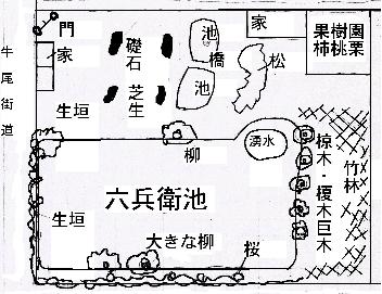 「六兵衛池」と呼ばれる前は、旧西野村所有の池で「総(そ)池」と言われていたようです。佐貫伍一郎著『郷村(ムラ)から市街(マチ)へ』(燈影舎2003p34)によれば、「厨子奥尾上の西南角に、周囲約三百メートルの大きい用水池、旧西野村共有の総(ソ)池があった。人々はこの池を「六兵衛池」と呼んでいた。伝承によると、清水(キヨミズ)焼の名工・何代目かの「六兵衛」が、この池の北側に別荘を構えたので、さながら別荘の池のごとく映ったので、「六兵衛池」と呼ぶようになったとのことだ。現在、この池は埋められ公園になっている」と説明されています。 |