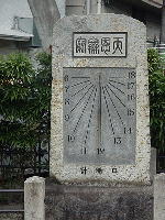 (6)日時計 日時計は、天智天皇御陵の入口近く、三条通りに面して建っています。これは、昭和13年に京都時計商組合が、創立20周年記念に建てたものです。 建立された頃は、時の記念日の6月10日には、この日時計の前に紅白の幕が張られ、盛大な時の記念式典が催され、学校からも先生が生徒を連れて参加したとも伝えられています。現在は、このようなことは行われていません。 この日時計は、高さ170cmぐらいの石の碑で、中央よりやや上に鉄棒のような針が突き出ており、石の碑のまわりには、数字が6から18まで刻まれています。左側6から始まり、真下が12となり、逆に右側にまわり、18で終っています。 これは、日の影で時間を告げるために、普通の時計と逆回りになるからです。日時計ですから、もちろん夜の時刻はなく、日中の太陽が出ている午前6時から午後6時の時刻に限ることになります。 山科の日時計が天智天皇の御陵の前に建てられた理由は、天智天皇が漏刻(水時計)を作った古事から、御陵前を選んだものであろうと思われます。 ちなみに、「時の記念日」は大正9年に6月10日と制定されていますが、これは「6月10日」は、天智10年4月25日「漏刻が始めて候時を知らせ鐘鼓をならす」と記されていて、この日を太陽暦に換算したものであると言います。 |