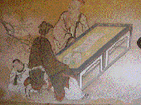 庭園は心字の裏文字を形取った池に観音堂や亀石を配置した回遊式庭園である。宸殿襖絵(ふすまえ)は動く襖絵として有名で、狩野益信により逆遠近法の手法により描かれている。その中でも有名なのが「九老之図」(写真)で、老人が書を広げている机を注視しながら移動していくと、いつの間にか机の向きが変わって見える。斜めに向いていた老人も、正面から眺めると正対して見える。 また、大石神社(山科区西野山)では、年末に古い札や破魔矢、神棚などを焼くための納札所が設けられ、12月31日夕方に「忌火」が点火される。火は、1月15日のどんど焼きまで燃え続け、新年に参拝客が、古い札などを焼いたりする。 (写真は山科毘沙門堂と「九老之図」の襖絵:「襖絵」は毘沙門堂発行パンフレットによる) *「忌火」 (いみび) 辞典によると、「斎火」「忌(み)火」とも書く。火鑽(ひき)りでおこした清浄な火のことで、供物の煮炊きなど神事に用いると言う。「いむび」「いんび」とも言う。 |