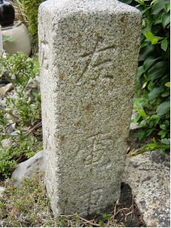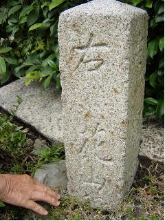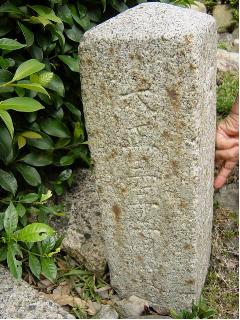 (4)向きの推定 この文字から向きを推定してみると、一面「左 電車」が西向き、二面「右 花山」が北向き、三面「」大正三年二月が東向きではなかったかと推定する。 理由は、これだと渋谷街道を東に歩いてきた人が三叉路から厨子奥本通りにを通って牛尾街道にさしかかった時に、左手に京阪電車京津線があって、それを指し示していると読めるし、また、御陵方面から牛尾街道を南に歩いてきた人が厨子奥本通りにさしかかった時に、右手に「花山」(あるいは花山稲荷神社への道か)があるので、それを指し示していると読みとれるのである。 (2007.9.4 鏡山次郎記) |