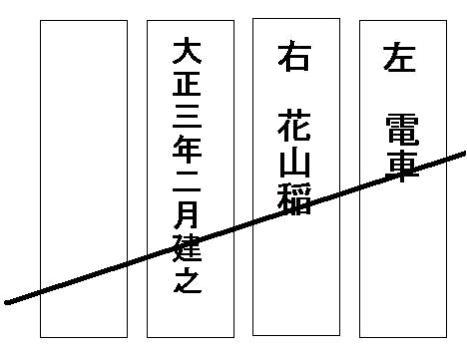(3)書かれている文字は「左 電車」「右 花山」 書かれている文字は、下半分はなくなっているので詳しくはわからないが、上半分は一面が「左 電車」とあるが、その下は欠けているためにわからない。二面は「右 花山」と読め、その下に「稲」らしい文字の上半分がかすかに読みとれる。また三面には「大正三年二月建(之?)」が読みとれ、四面には何も刻んでいなかった。 |