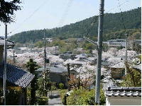 (26)安朱は山科の桜源郷(桃源郷)だった 安朱東海道町55にある日蓮宗秀典寺前の坂道から安朱地域を遠望すると、地域のあちこちに桜の花が咲き乱れ、まるで古来から中国で言われる「桃源郷」のような景観を呈しています。 安朱地域には、山科疏水沿いをはじめ、毘沙門堂、道路沿いや家庭の庭にもたくさんの桜が植樹されていて、春ともなれば桜満開の景観に、多くの人たちが訪れています。 「桃源郷(とうげんきよう)」ならぬ「桜源郷(おうげんきよう)」と言ったところでしょうか。 (安朱・東海道町から遠望) |