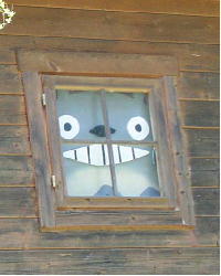 (27)トトロの森(安朱保育園) 安朱地域にある日蓮宗大立寺の向かい側に「トトロの森」という安朱保育園園児のための広場があります。 さまざまな遊具の外に、山小屋の窓からトトロが覗いている姿があり、とてもほほえましく感じました。 この場所で、幼児達は元気に遊び、自然を満喫していることでしょう。 (安朱・東海道町) |