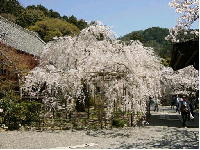 (28)毘沙門堂境内の「しだれ桜」 毘沙門堂境内、宸殿の前にある枝垂れ桜は「毘沙門しだれ」とも呼ばれる、樹齢100年以上のシダレザクラです。幹周は2.3メートルあり、樹高は7.8メートルあります。 天然記念物の指定はありませんが、京都市の「区民誇りの木」になっています。最近ではかなりの人気の桜スポットになったようで、春ともなれば、観光客でにぎわっていました。 毘沙門堂は、もともとは京都市内の出雲路通にあったお寺ですが、応仁の乱で荒廃し、江戸時代にこの山科の地に移して再興されました。出雲路通にあったころから桜の名所として知られていたようで、この地に移されてからも、寝殿前に枝垂れ桜が植えられたといいます。 (安朱・稲荷山町) |
