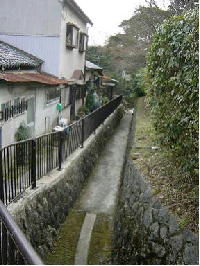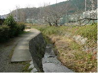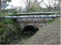 (7)山科疏水と安祥寺川との立体交差地点 山科疏水と安祥寺川が立体交差している所で、こうした川の立体交差はたいへんめずらしいと言えます。 これは従来からあった安祥寺川(明治時代は旧安祥寺川に流れ、下流は櫃川(山科川の古名)と呼ばれていた)の流れを活かすと共に、山科疏水を京都まで通じるようにするために工夫されたものであったのでしょう。 山科疏水(第一疏水)は1890(明治23)年に完成しましたから、この立体交差地点もその頃できたものでしょう。琵琶湖疏水は、水力・かんがい・舟運等に利用されるとともに、山科には新しい景観をもたらしました。 (安朱・中溝町) |