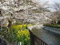 (32)山科疏水の花見の名所 春の桜の季節には、山科疏水沿い一帯は、花見客でたいへんにぎわいますが、その中でもお勧めのポイントは、安朱橋(毘沙門堂参道と疏水との交差点にかかる橋)から東側を見る景色です。多くの人たちがカメラを構えて年に一度の景観を写しています。 桜の下には、地元の方々のご協力で植えられた菜の花が歩道沿いに美しく咲いて、上の桜の花のピンク色、疏水の緑に調和しています。 (安朱・馬場ノ東町) |