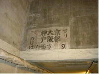 (3)JR東海道線山科駅横南北通路 旧国鉄山科駅は、1921(大正10)年8月1日に新路線が開通して、開業しました。当時、改札口を通ってプラットホームに行く通路は、現在のJR東海道線山科駅横南北通路を通っていました。その名残に、通路の天井付近に当時のプラットホームを示した文字が残っています。 この東海道線は、当初2線だったものが、戦時中に「輸送力増強策」として上りが一線増設され三線となりました。そして、戦後1956(昭和31)年11月19日に電化がなされ、1970(昭和45)年にさらに一線を追加して複々線となり現在に至っています。 (安朱・中小路町) |