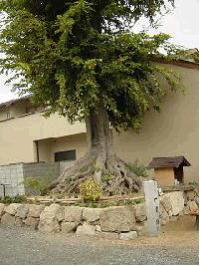 (11)岩屋神社御旅所とクスノキ 奈良街道の「大宅甲ノ辻バス停」の横に「岩屋神社御旅所」があります。 大きな岩の上に、石碑が建てられているのが特徴で、前のバス停横にあるクスノキは「山科区民の誇りの木」の一つに選ばれています。 「御旅所」とは、神社の祭礼(山科祭)の際に、お神輿が巡幸の途中で休憩する場所です。岩屋神社の場合は、お神輿が巡る地域も広いので、「御旅所」はいくつもあるそうです。特に大塚西浦町にある「皇塚」も岩屋神社の御旅所として有名です。 また、この御旅所の前にある「クスノキ」も御神木とされ、高さが10メートル、幹周が2.8メートルあるそうです。一時は樹勢も弱まっていたそうですが、「樹勢回復・環境改善工事」や剪定などの努力があって、現在では元気な姿を見せてくれています。 |