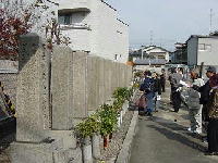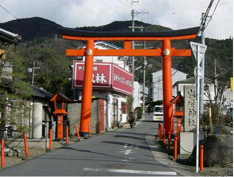 (4)大宅 岩屋神社 一の鳥居 奈良街道に面して、大宅古海道町にひときわ目立つ「岩屋神社 一の鳥居」が建っています。 この鳥居をくぐってまっすぐ東へ行けば、岩屋神社にまで達することができます。岩屋神社は、地元大宅地域だけではなく、厨子奥、御陵など山科の中でも広い地域に氏子を持っていますので、山科各地からの参拝客を迎えたり、また「山科祭り」時のお神輿なども通ったりする道として栄えていたものと思います。 山科祭りについては、平安末期からの記録もあり、岩屋神社からは3基も神輿が出て、山科各地を巡ったとあります。 |