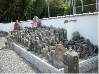 (8)たくさんのお地蔵さん(歓喜光寺境内) 大宅の歓喜光寺境内には、たくさんのお地蔵さんがおられます。約450体ほどあるそうです。 このお地蔵さんは、昭和50(1975)年に、歓喜光寺が東山五条坂からこの地に移転し、復元建立された時にいっしょに移ってこられたということです。 たくさんのお地蔵さんの表情はやさしく、参拝者を見守ってくれます。 |