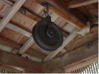 (10)若宮八幡宮手水所屋根に残る滑車 幾度となくお詣りさせていただいている音羽の若宮八幡宮ですが、手水所でふと上を見ると、屋根に大きな滑車が取り付けてあるのに気がつきました。 これはおそらく昔の井戸で使った滑車に違いありません。とすると、この手水所の場所は、昔は井戸があったものと思われます。昭和37(1962)年の「山科中学校校区図」に、当時の山科中学の子ども達が調べた井戸の図があり、この若宮八幡宮の井戸も記入されていますから、その当時にはまだ井戸があったものと思われます。 |